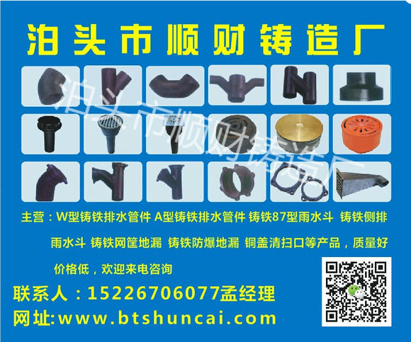主营业务:W型铸铁排水管件铸铁87雨水桶铸铁网篮地漏铜表面清洗口,铜盖清洗口等主要系列产品。